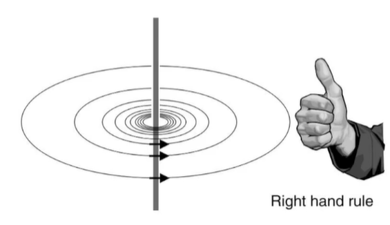 전류의 방향은 엄지, 자기장의 방향은 남은 손가락의 방향이다.